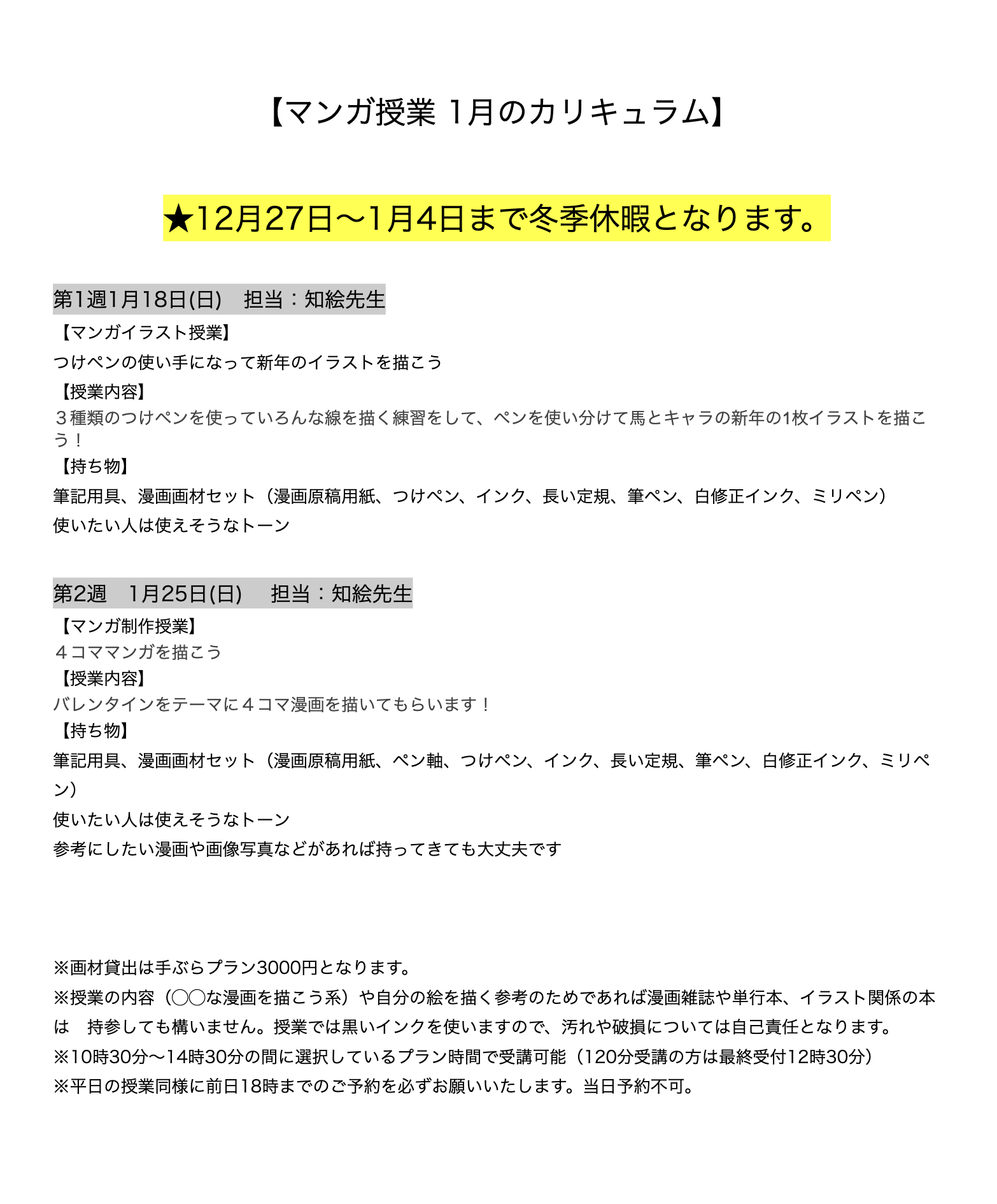【マンガ授業 1月のカリキュラム】
